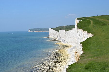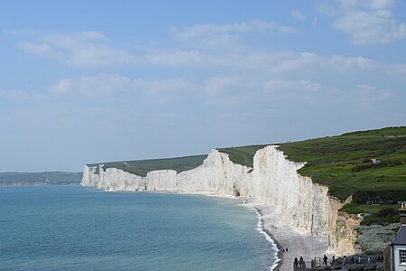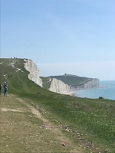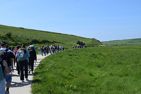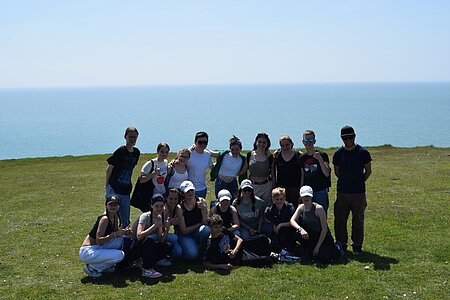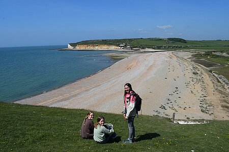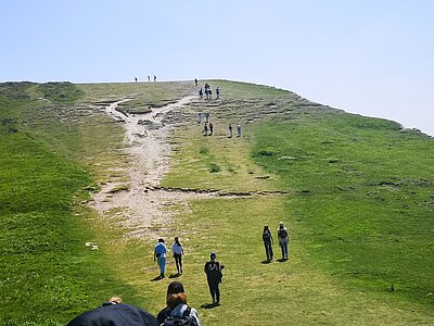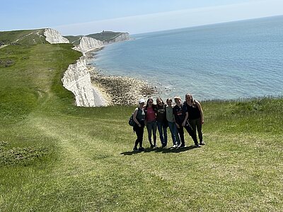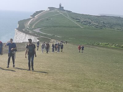 The day began at 8:15 am when everyone got to their pick-up points but things didn't go as planned: The trip to London the day before had lasted almost two hours longer than expected so our bus driver couldn't drive us at 8:15 am because he didn't have enough break time between the trips. So the teachers improvised and let us go into the nearest shopping mall where we could do a variety of different things like drink bubble tea or coffee, buy lunch or five litres of water for our following trip.After we had gone shopping and our bus driver got his rest we went to the Seven Sisters at roundabout 11 am. As we began walking through wide meadows and hills we got an impression of the landscape until we arrived at the first "Sister". It was the first challenge of our trip where you could see that some were walking more slowly and stayed behind and there were the ones that bursted with energy who didn't want to stop for anything and who were asked to stop by the teachers and Ole so that the group wouldn’t be divided into two parts.