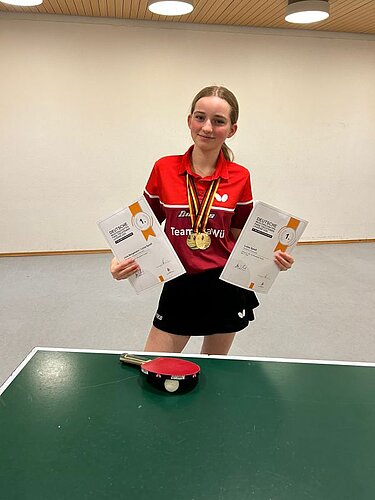 Luisa Spieß aus der Klasse 9b hat am 21.März 2026 in Frankfurt bei den Deutschen Jugendmeisterschaften Parasport im Tischtennis sehr erfolgreich teilgenommen. In ihrer Leistungsklasse AB holte sie sich gleich 2 Goldmedaillen und wurde sowohl im Einzel als auch im Doppel, mit ihrer Partnerin vom TSC Dachau, Deutsche Meisterin 2026. Ein großer Erfolg für das junge Talent!