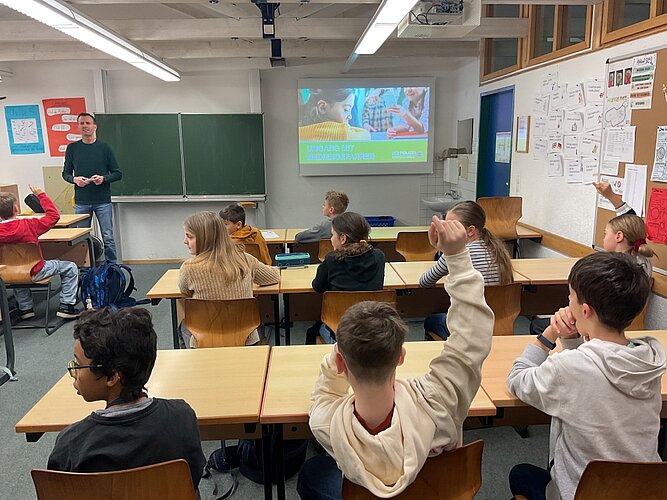 Ein zentrales Thema des Vortrags war das Cybermobbing. Herr Füchsle erklärte den Schülerinnen und Schülern die Auswirkungen von Mobbing im digitalen Raum und betonte die Wichtigkeit von Respekt und Unterstützung. Die Fünftklässler erfuhren, wie sie sich und andere schützen können.