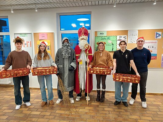 Am Freitag, den 05.12., hatten wir einen ganz besonderen Besuch: Der Heilige Nikolaus ist mit seinem treuen Begleiter Knecht Ruprecht im Haus und verteilt im Auftrag und in Begleitung der SMV leckere Klausenmänner! Knecht Ruprecht hat – wie es sich gehört – zwar seine Rute dabei, aber am Ende gibt es vermutlich höchstens mahnende Worte.