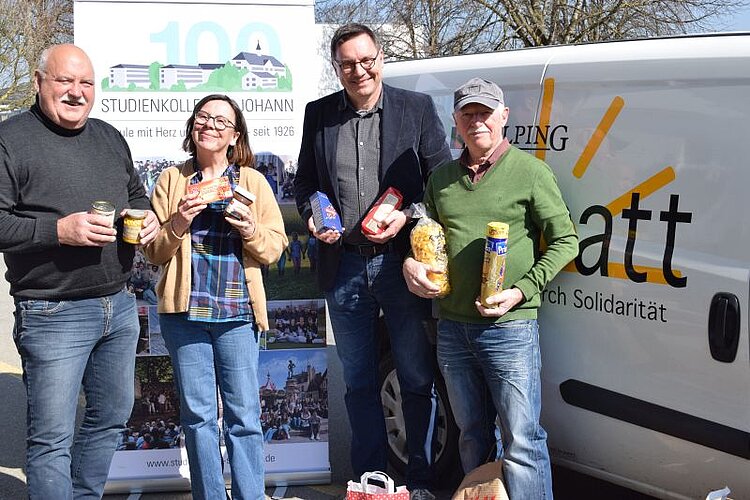 Das Studienkolleg St. Johann kooperiert mit der Solidarischen Gemeinde Aulendorf. Als der Vorsitzende Josef Bühler anfragte, ob wir an der Schule mit der Solidarischen Gemeinde in ihrem Projekt mitarbeiten, Solisatt mit Lebensmittelspenden zu unterstützen, war die Antwort klar: "Ja, gerne!" So eine Spendenaktion passt gut zur Fastenzeit und zum Geist der Schule. Am Freitag, den 20.3. 2026 wurden die Lebensmittel am Studienkolleg abgeholt. Josef Bühler bedankte sich bei Schulleiter Marc Grünbaum: "So viele gute Lebensmittel, die bei Solisatt gebraucht werden. Ihre Spendenaktion ist für uns auf jeden Fall wertvoll!"