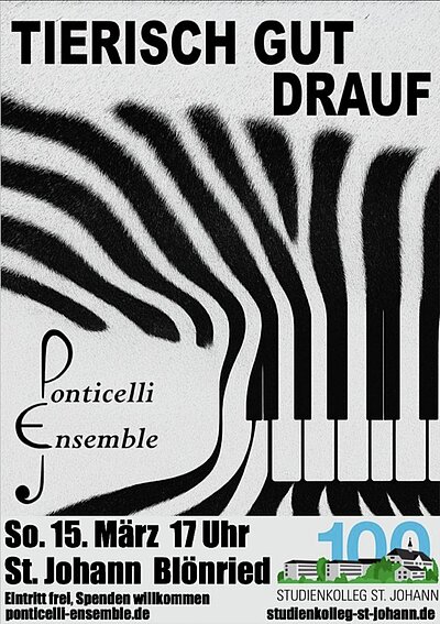 Im 100-jährigen Jubiläumsjahr öffnet das Studienkolleg St. Johann seine Türen zur nächsten Jubiläumsveranstaltung: Das Ponticelli Ensemble spielt am Sonntag, 15. März, um 17.00Uhr in der Kulturhalle seinaktuelles Programm: „Tierisch gut drauf!“ – ein musikalischer Streifzug voller Eleganz, Energie und überraschender Tierbegegnungen.